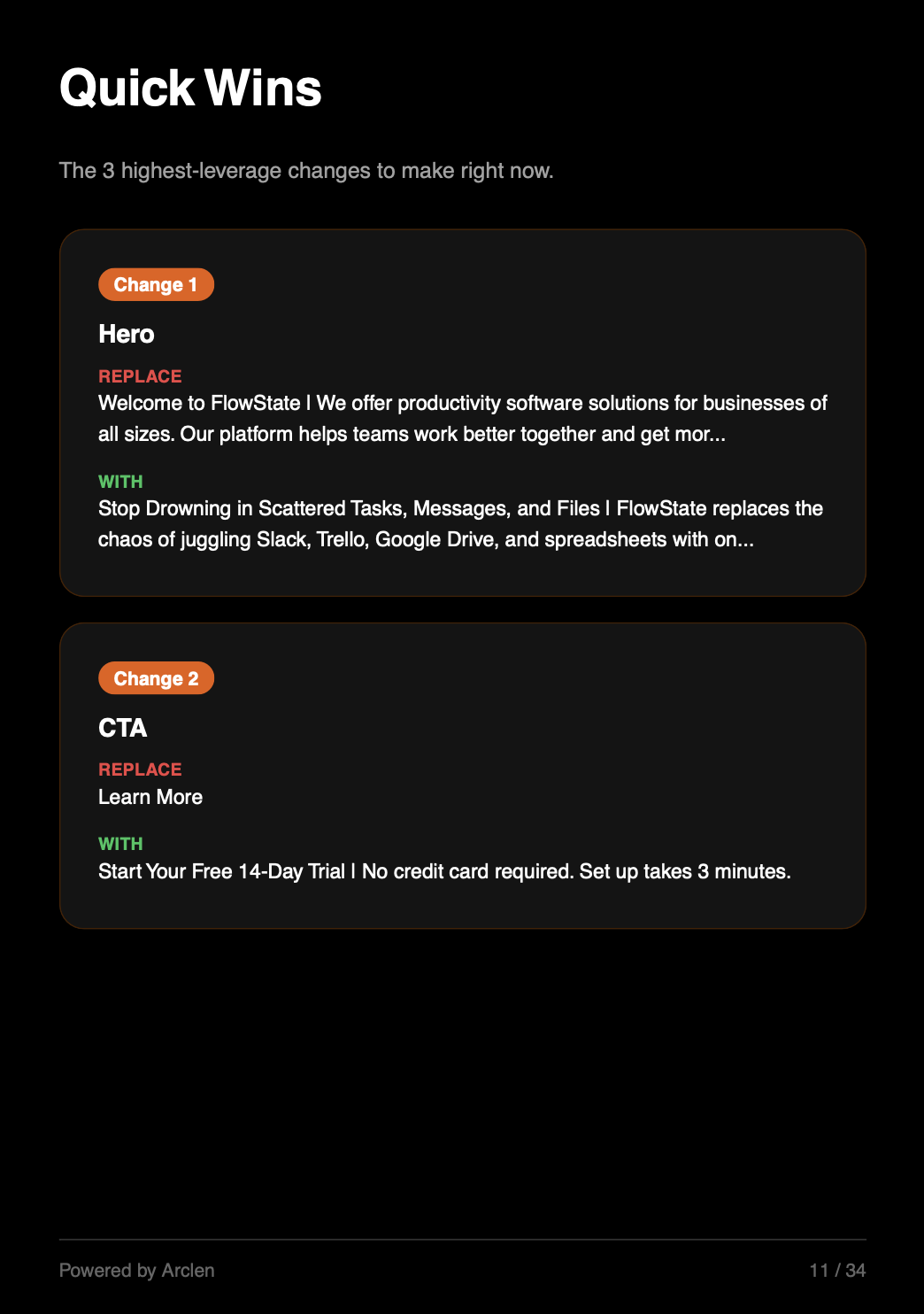 The report found my headline was costing me. Changed it in 10 minutes based on the rewrite. Conversions up 23% that week.