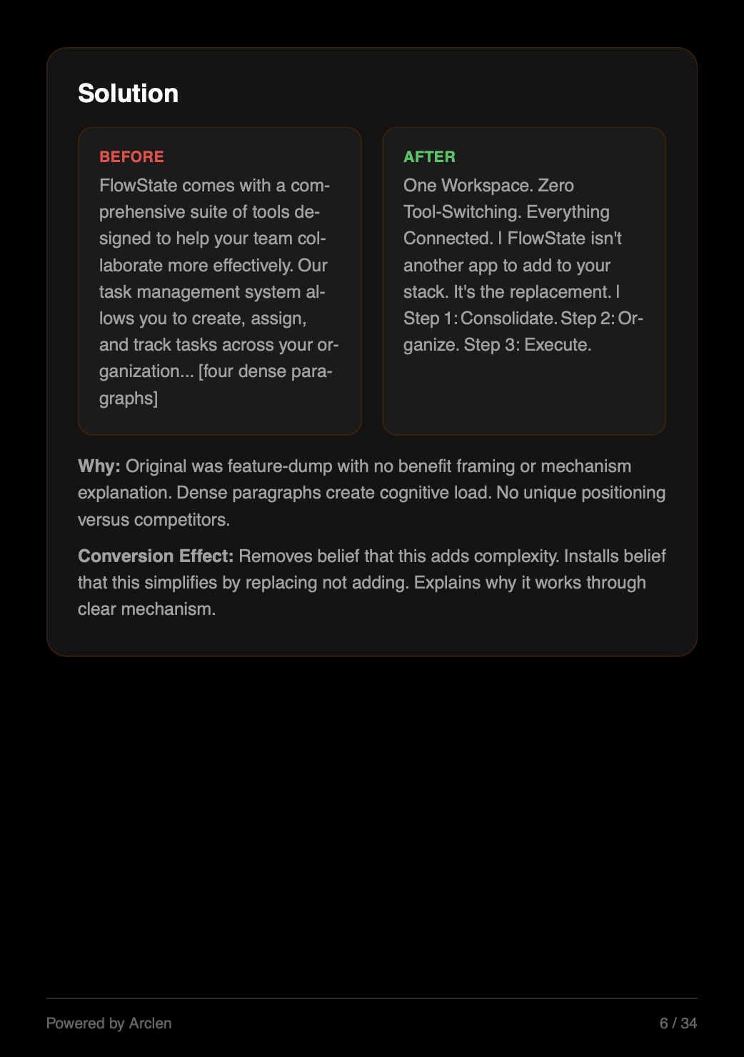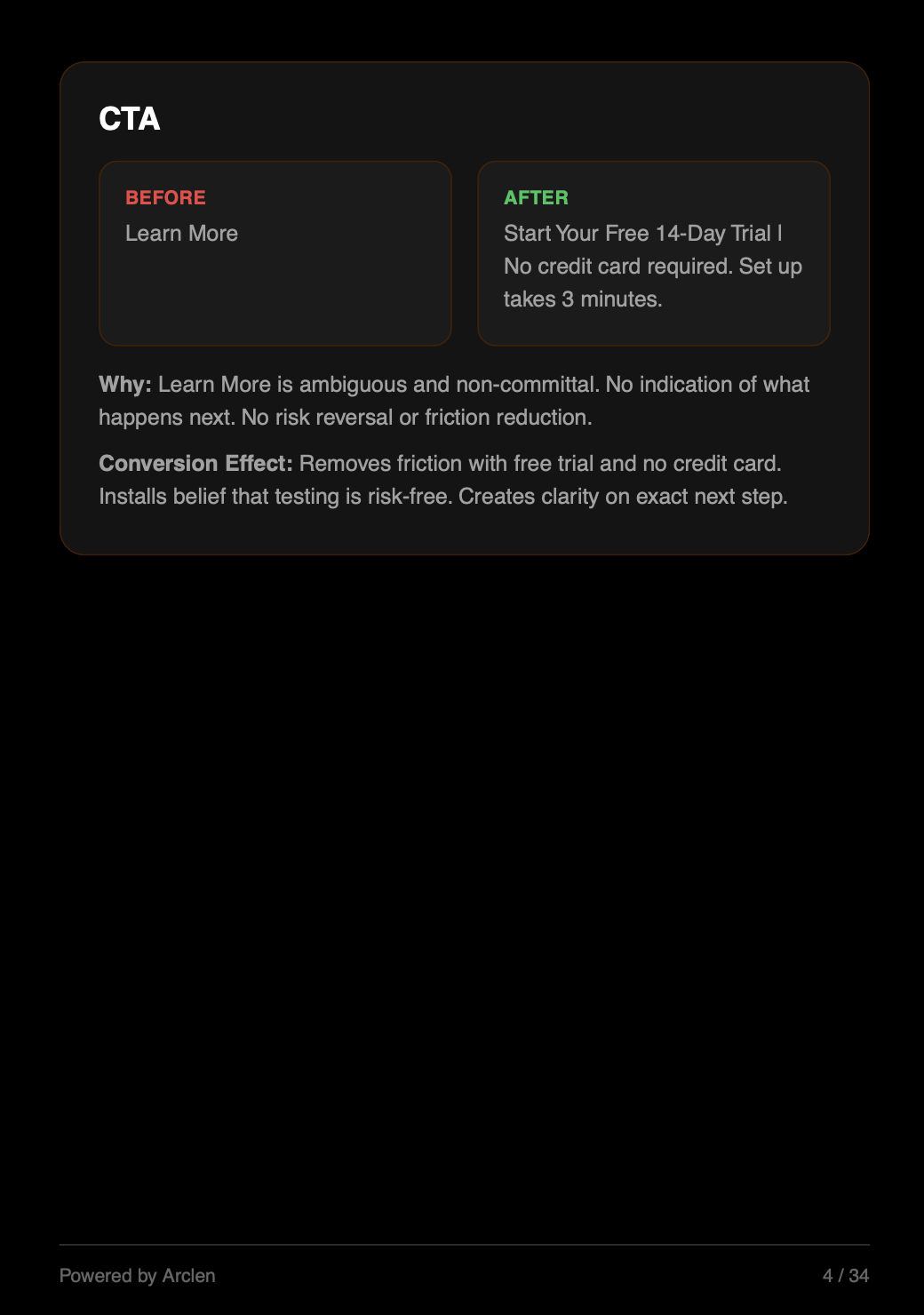 Download a PDF with your primary leak identified, severity rated, and production-ready rewritten copy for YOUR page.